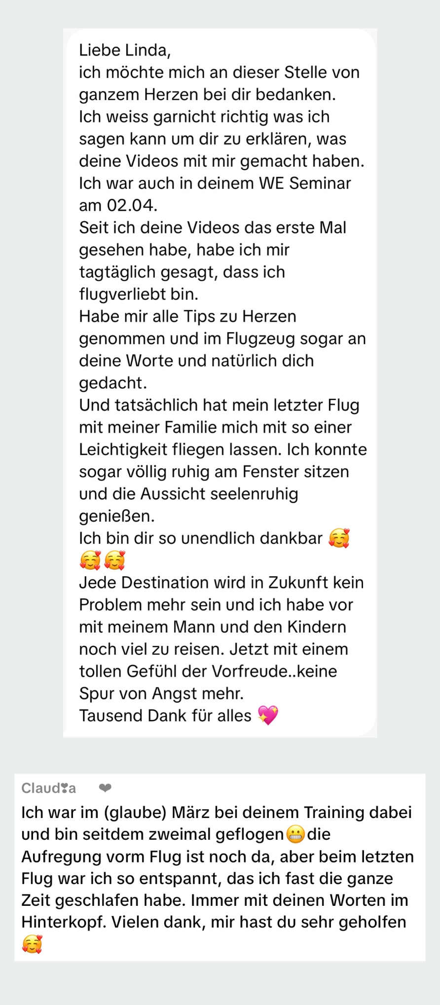 Dann habe ich mich auf den Weg gemacht, um herauszufinden, wie man Flugangst wirklich überwinden kann. Ich habe die Überprüfung zur Heilpraktikerin für Psychotherapie erfolgreich abgeschlossen, bin in NLP (Neurolinguistisches Programmieren) ausgebildet und befinde mich aktuell in einer Weiterbildung in Verhaltenstherapie.