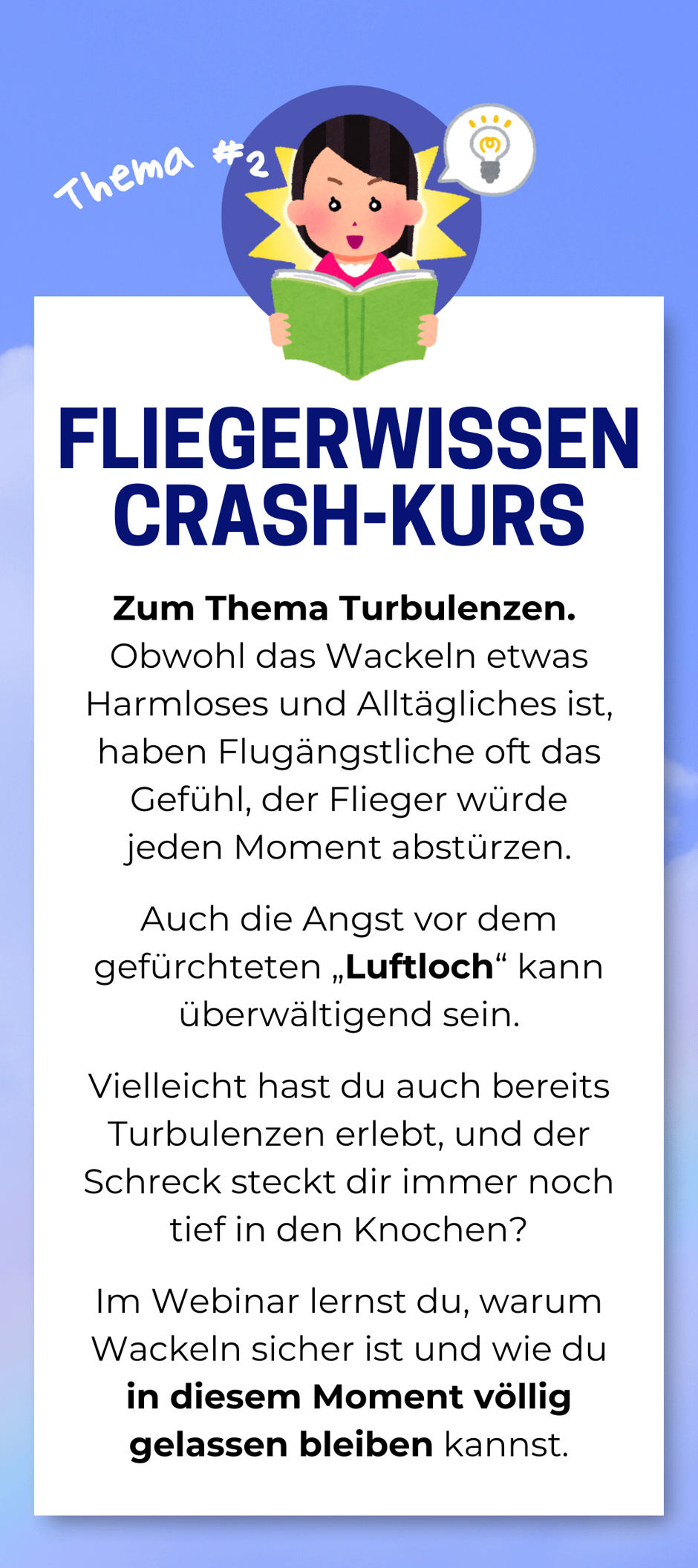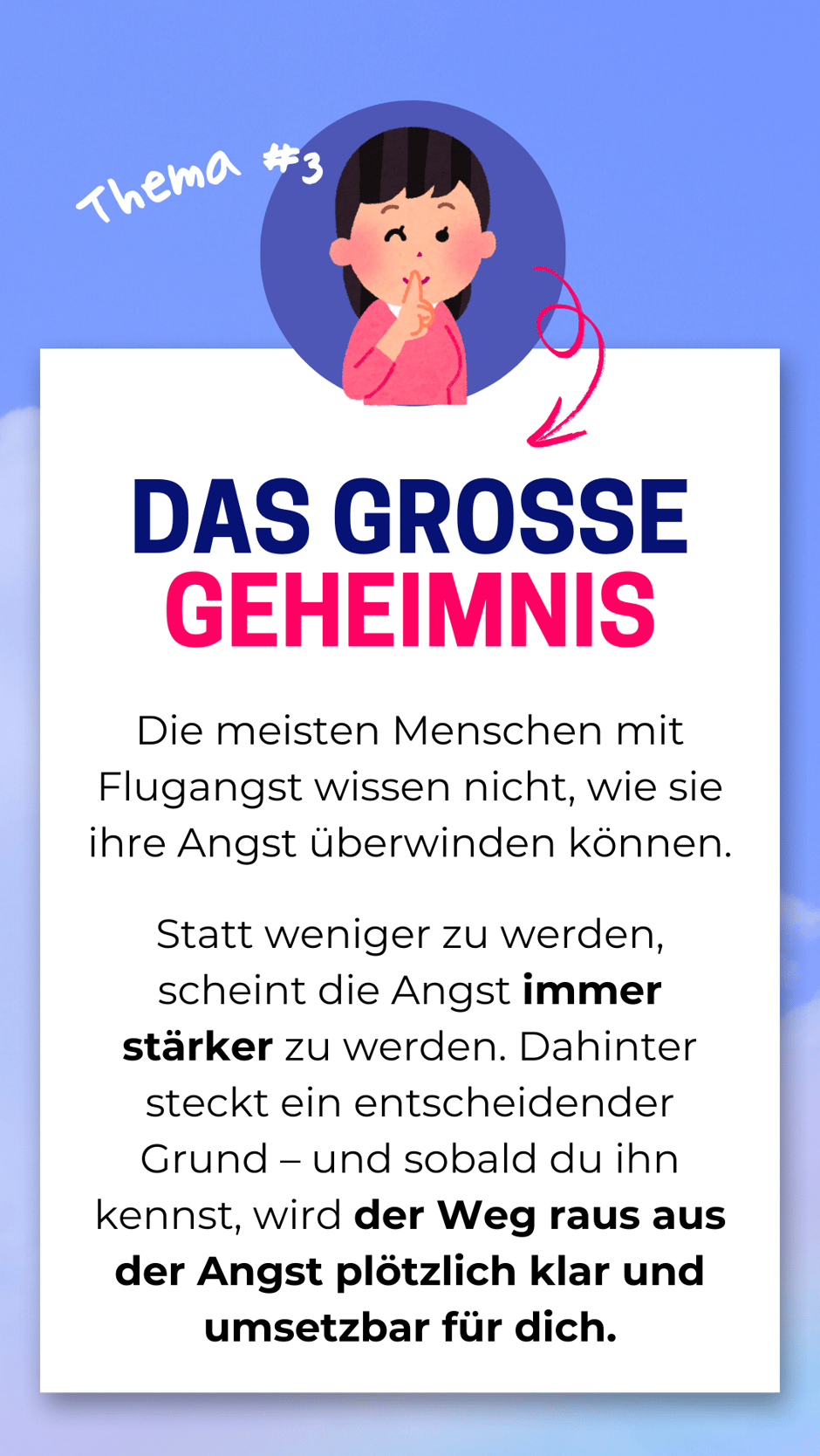 Außerdem verrate ich dir das große Geheimnis, wie du deine Angst überwindest und dich sogar auf deinen nächsten Flug freuen kannst.